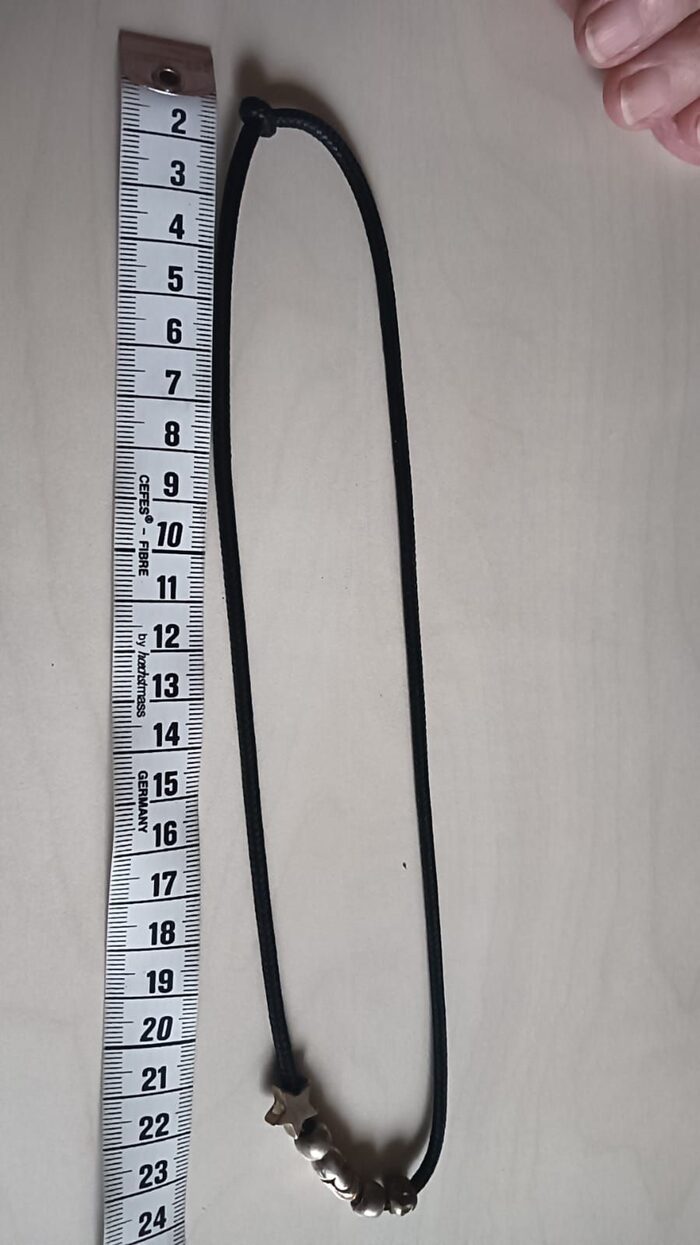 con cordoncino nero e ciondoli metallo .
