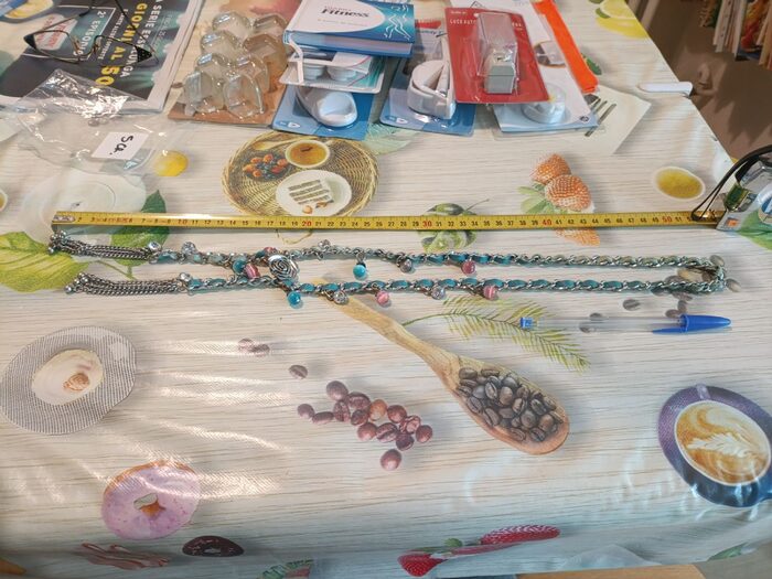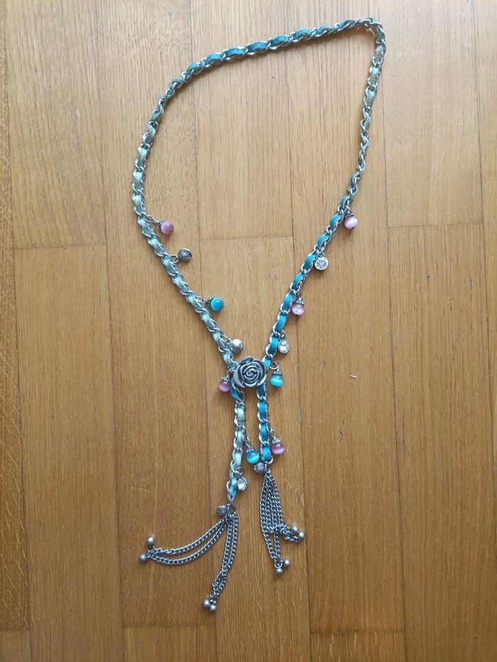 Collana in metallo color argento con intrecciata una striscia di pelle azzurra, con una rosa in metallo al centro e con pendagli di pietre dure e cristalli (tutto finto direi). Lunghezza della parte chiusa (fino alla rosa) 34x2, lunghezza totale 53 cm .