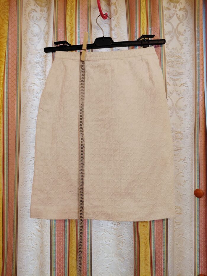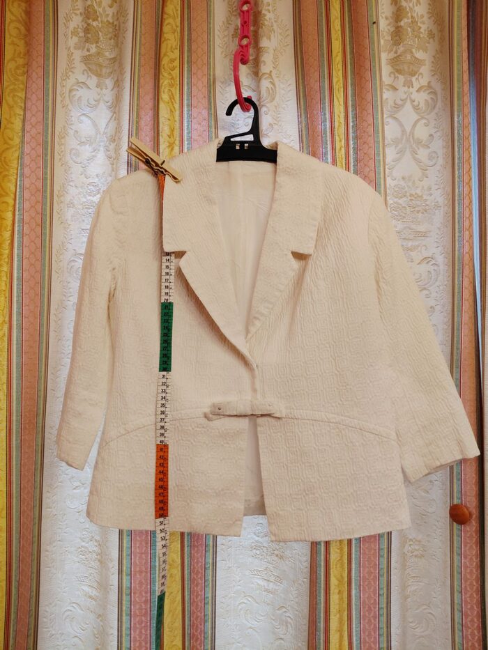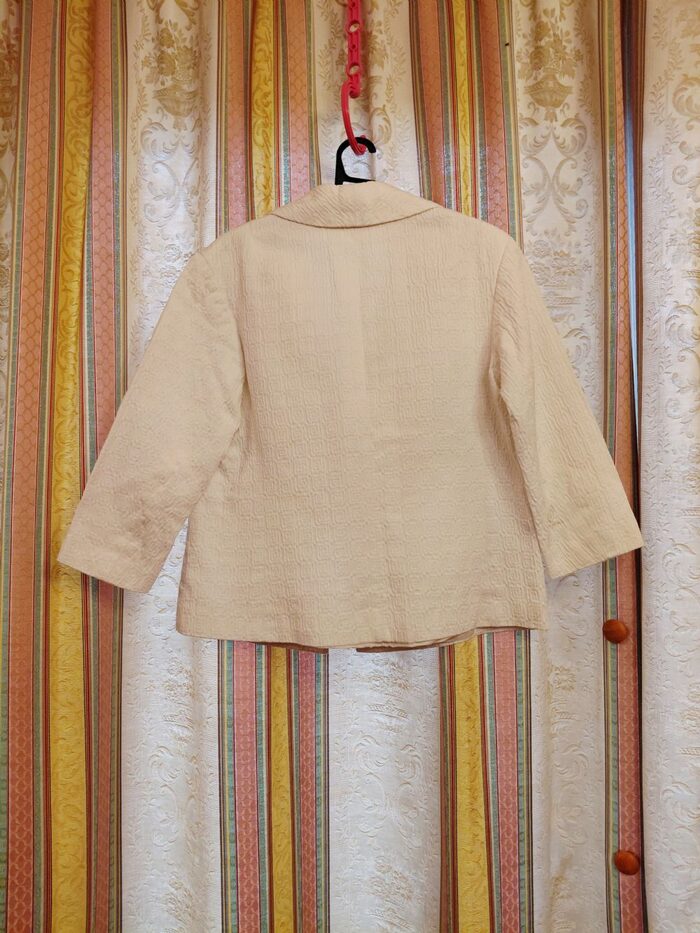 Completo donna tg.42 giacchina manica 3/4 e gonna. Ho messo usato tanto perché datato, di quei capi che si facevano una volta. Curato nei dettagli, ma da troppi anni nell'' armadio e ho bisogno di fare spazio. Ho riattaccato il fiocchetto alla giacchina affinché questo annuncio fosse completo, ma la portavo senza per dare un taglio più moderno. Perfetta sul jeans. Da rinfrescare, la gonna ha un leggero alone che segnalo con uno spillo, vedi foto dedicata. Non c é l etichetta della composizione ma direi cotone o piquet, il tutto completamente foderato. Volendo allungare la gonna restano ancora un paio di cm di orlo. Misure in foto. Consegna a mano o collettiva Varese. .