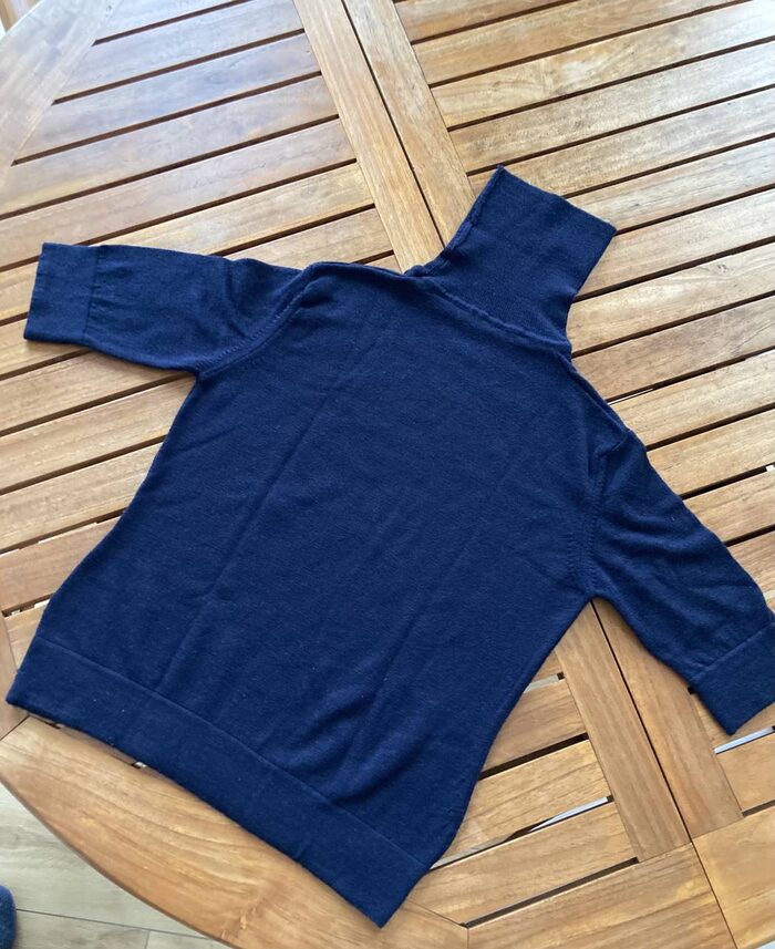 In pura lana. Maniche corte sopra il gomito. Non c’è etichetta. Veste 42/44. Colore più scuro che in foto. Messa forse una volta: non amo capi invernali a manica corta. .