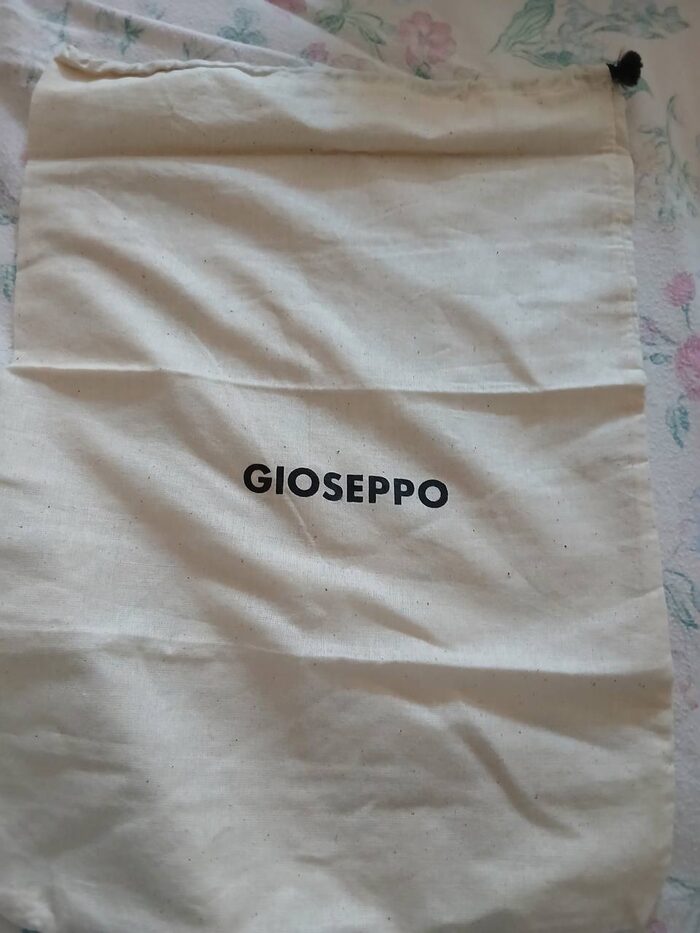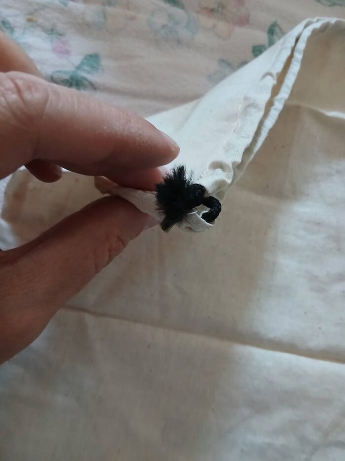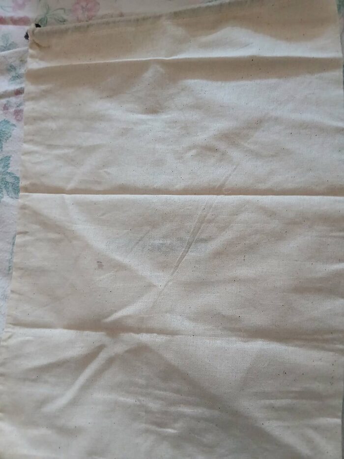 Credo sia in cotone, ma ovviamente non cc'è l'etichetta della composizione. Con un cordino per la chiusura. Dimensioni 26x40cm. .