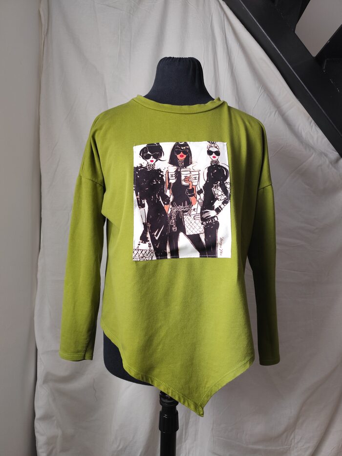 Felpa leggera in cotone garzato, colore verde acido con stampa applicata. Modello ampio, con nodo davanti, spalla scesa ampia e manica lunga, comoda e versatile per un look sportivo casual.