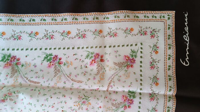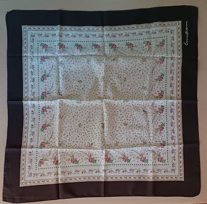 Foulard fiorellini con cornice marronePenso sintetico.Quando lo metti in controluce sulla cornice marrone sembrano ci siano dei difetti del tessuto ma utilizzandolo normalmente non si vede nulla. Misura: 74 x 74 cm .