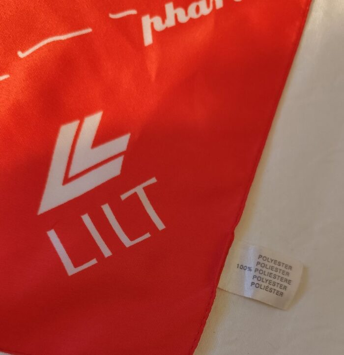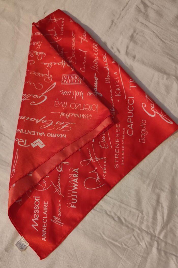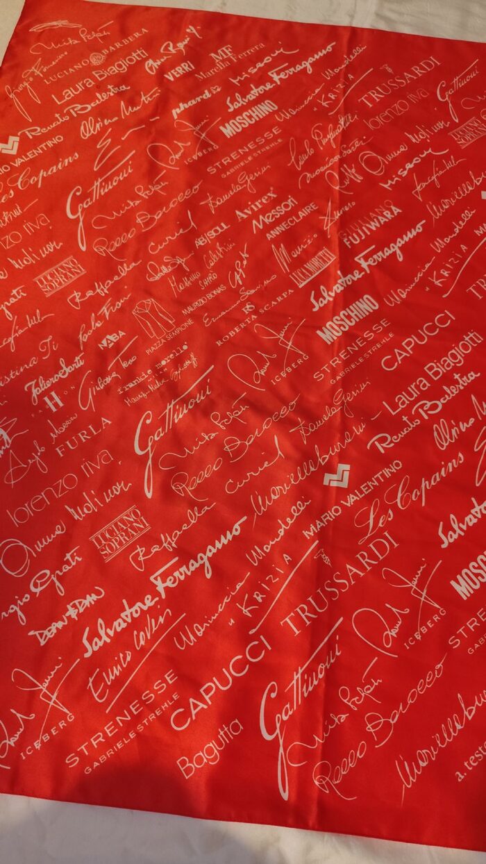 Foulard quadrato, in raso sintetico, con stampa di marchi famosi, colore rosso chiaro, più simile alla prima foto.Tessuto in raso sintetico 100%poliestere.Misura cm 78x81. .