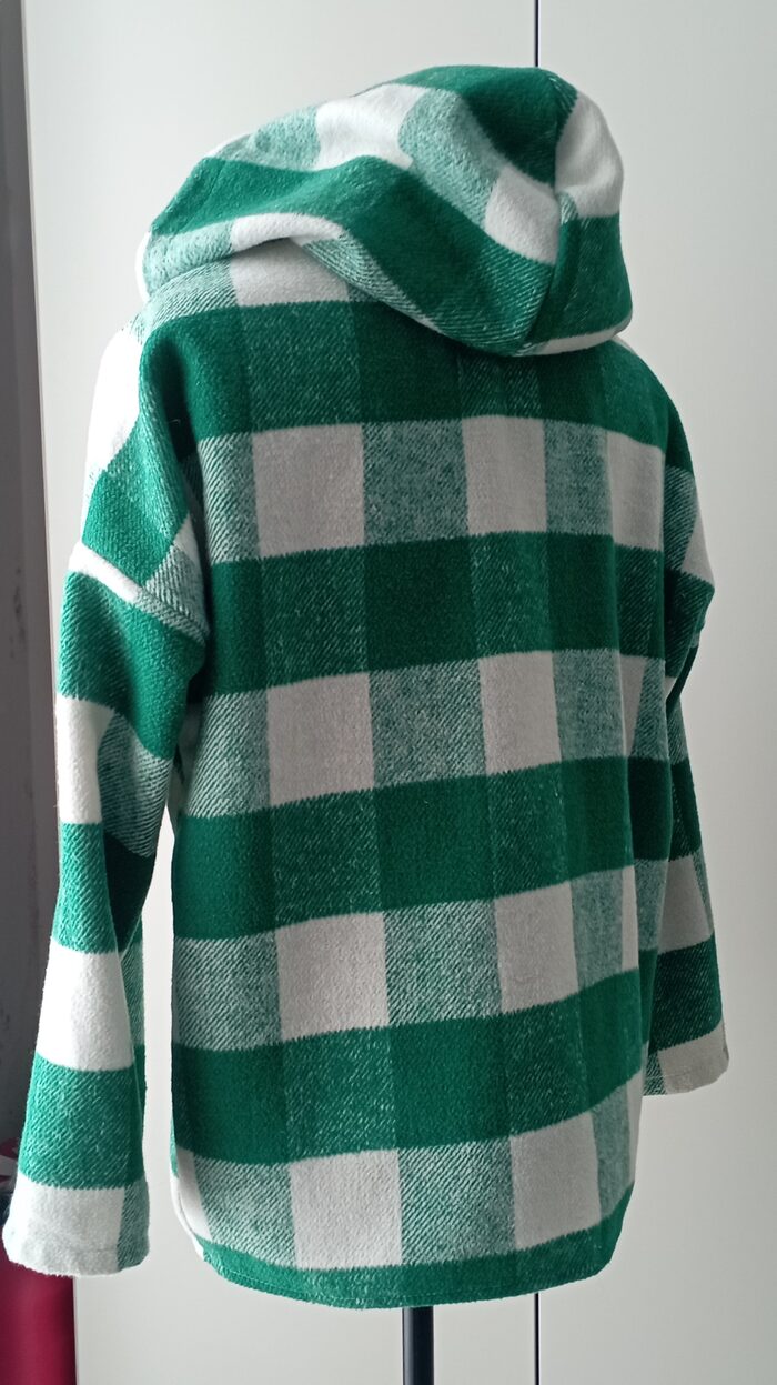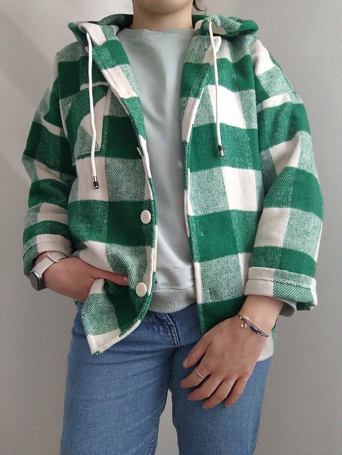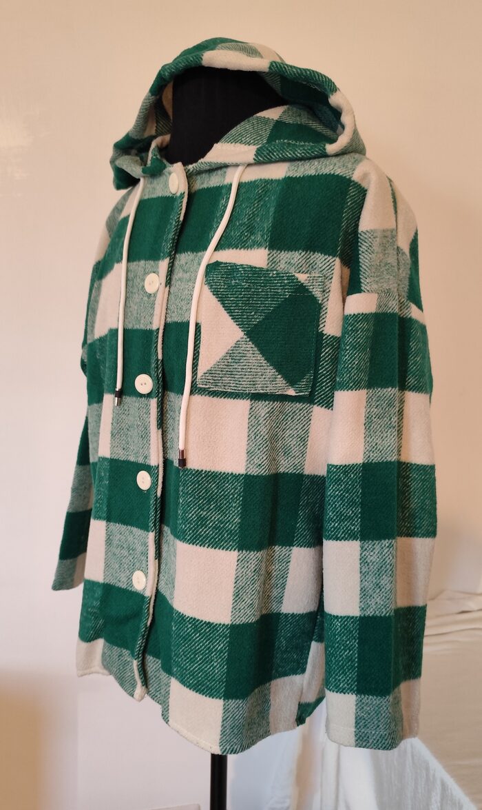 Giacca camicia carina e versatile con fantasia a quadri verde e bianca. Modello con cappuccio, spalla scesa e giromanica ampio a kimono. Ha un taschino sul davanti e si chiude con 5 bottoni.