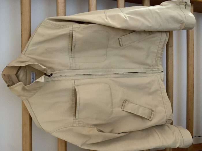 giacchetto leggero in cotone, taglio jeans, color sabbia. Taglia M/L. Ha il colletto un po’ consumato ma è ancora utilizzabile. .