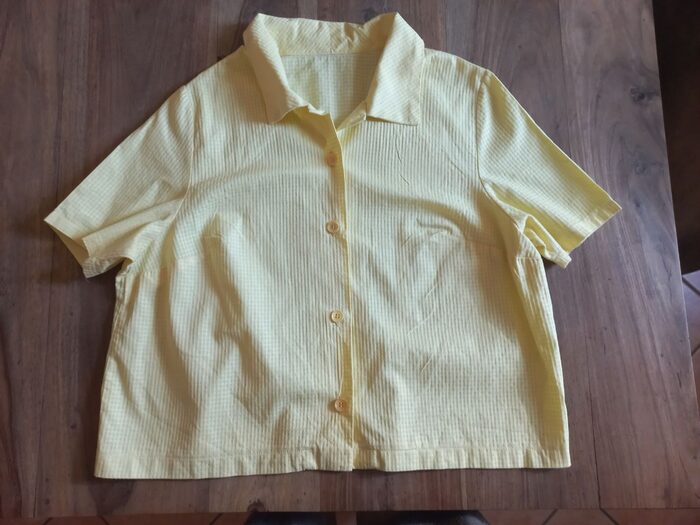 Non ha etichette ma è sicuramente di cotone, la taglia dovrebbe essere una 44 perché mi è stata data da una persona che indossa questa taglia.È leggera, direi estiva, di un bel giallo e tenuta benissimo. .