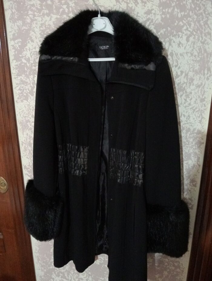 Giaccone donna marca Extasy,taglia 44.Misura spalle cm.38, lunghezza cm.84 e maniche lunghe cm.58.La fascia in pelle al centro ha perso la parte superficiale,io penso che si possa rimediare o staccandola tutta o anche levando la fascia.Qualcosa si può fare,ma non sono un sarto. .