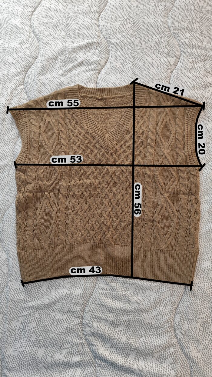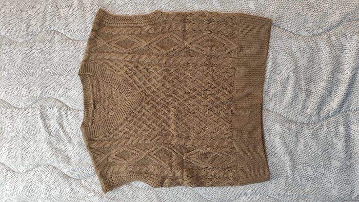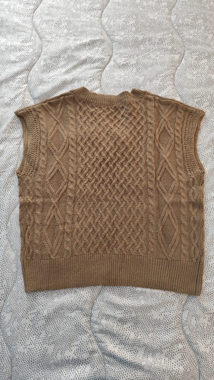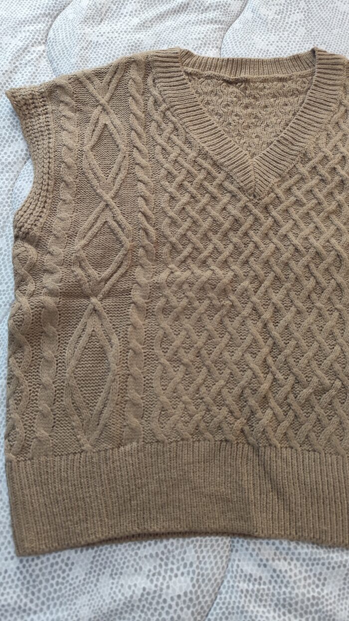 Gilet in maglia marrone, modello casual e sportivo, scollatura a V, texture morbida, lavorazione con trecce, leggero. Senza difetti.
