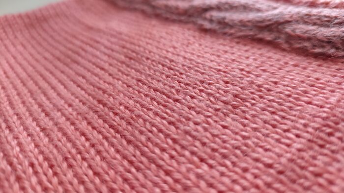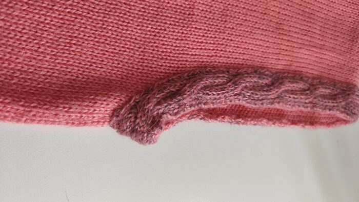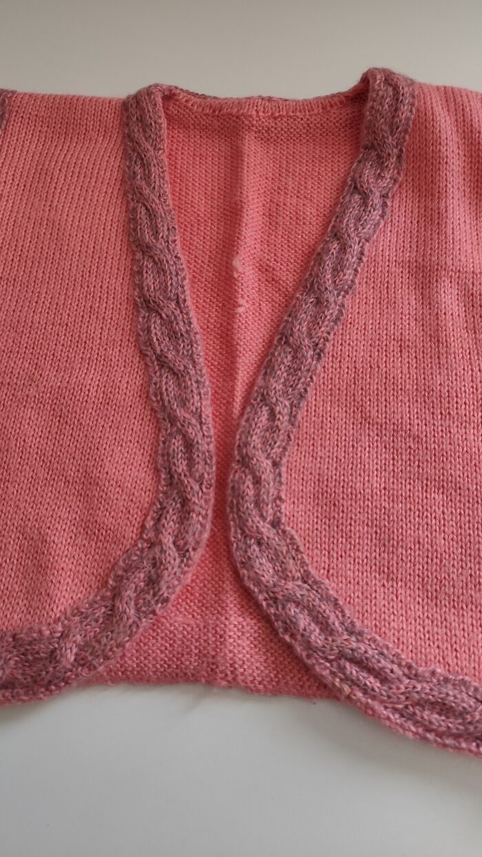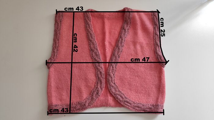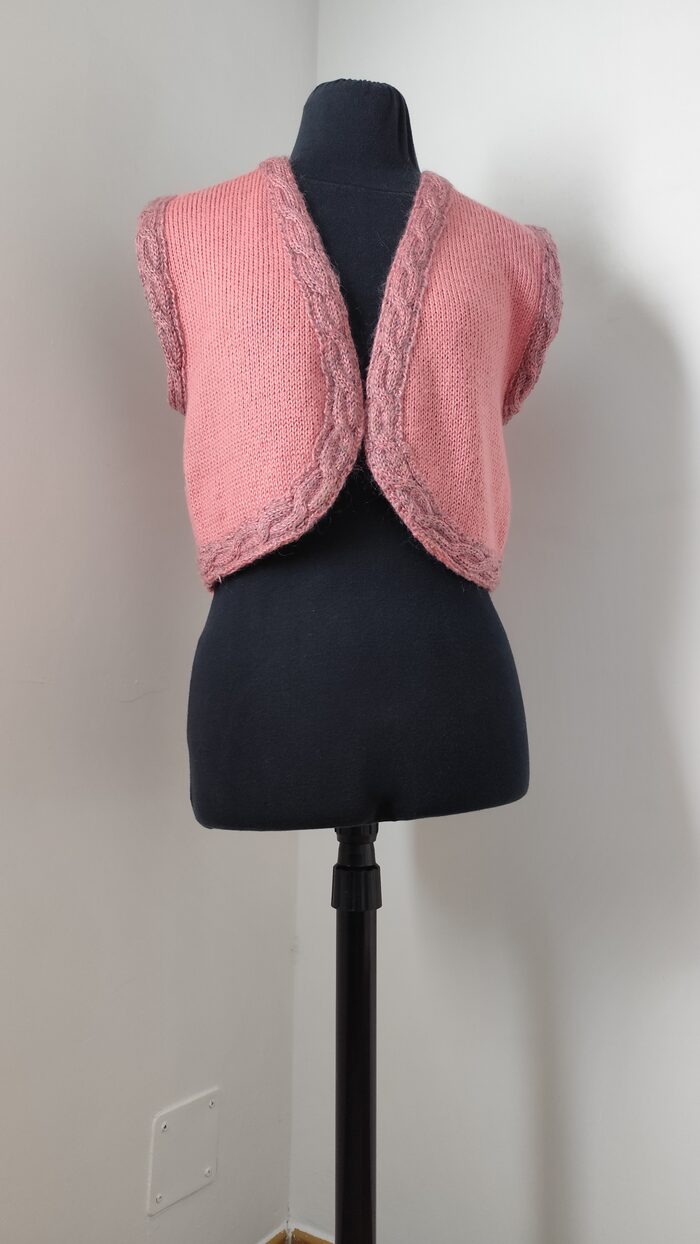Gilet fatto a mano con lana rosa, lavorazione a maglia rasata, bordi rifiniti con treccia. In perfetto stato, caldo ed elegante, manifattura raffinata e resistente.