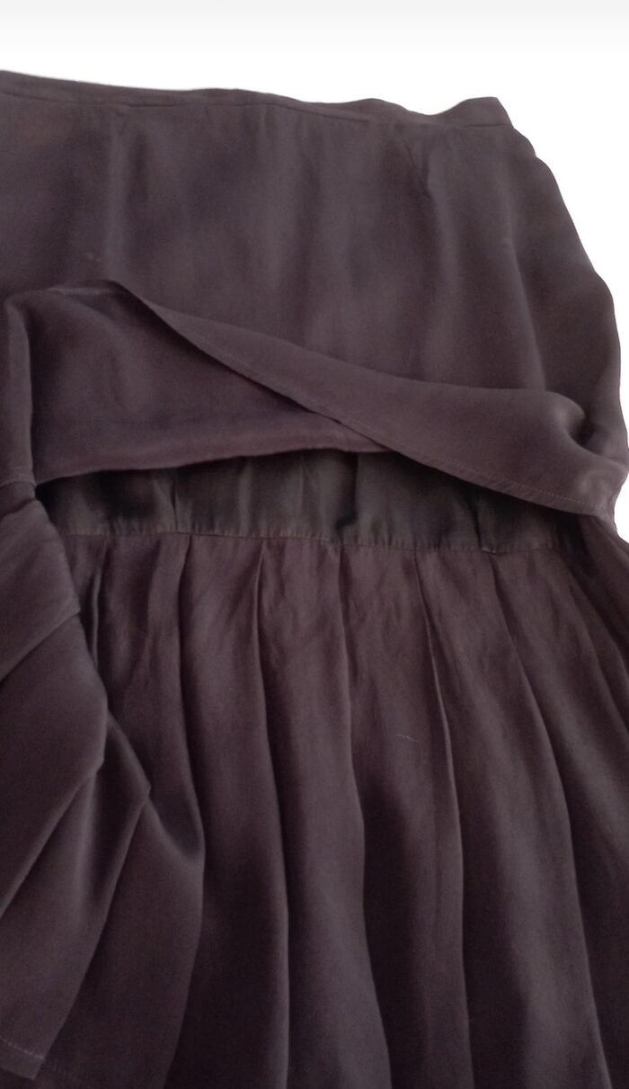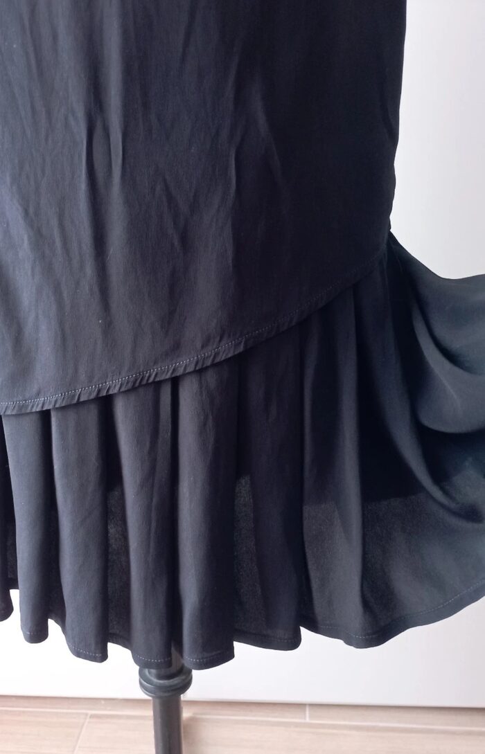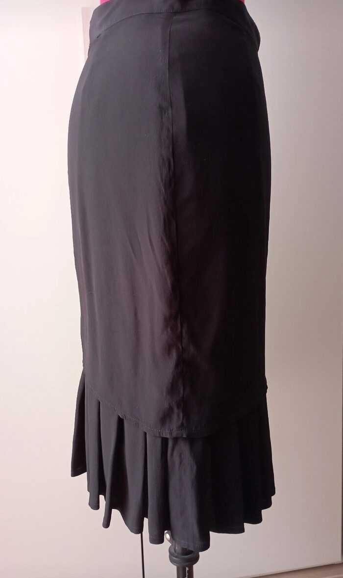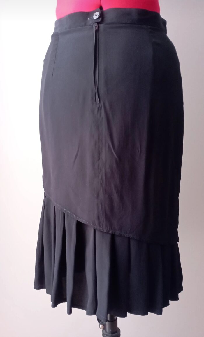 Bellissima gonna vintage nera, tubino a vita alta; è composta da uno strato superiore liscio asimmetrico e uno strato sottostante che si apre formando delle pieghe. Molto particolare ed elegante, in ottime condizioni.