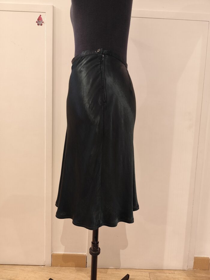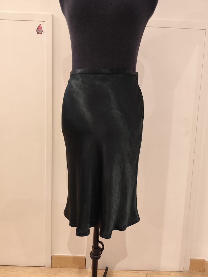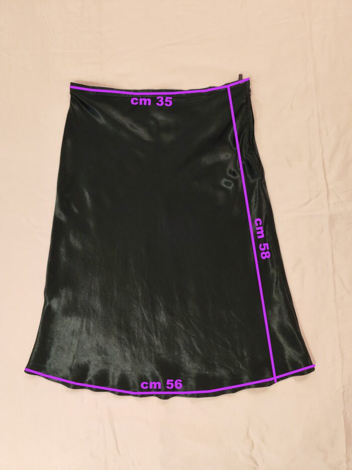 Elegante gonna svasata, vintage di colore verde scuro. Modello semplice, con tessuto in sbieco e piccola cintura in vita con bottone e zip. Il taglio del tessuto gli dona fluidità e aderenza nella parte superiore, non ha difetti, in perfetto stato.