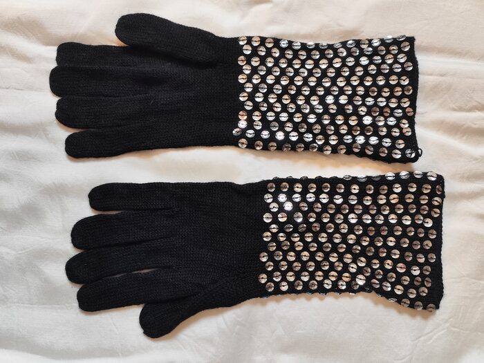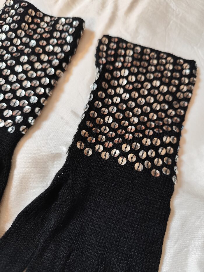 Paillettes argentate sfaccettate, ricamate e cucite su tutta la parte del braccio.