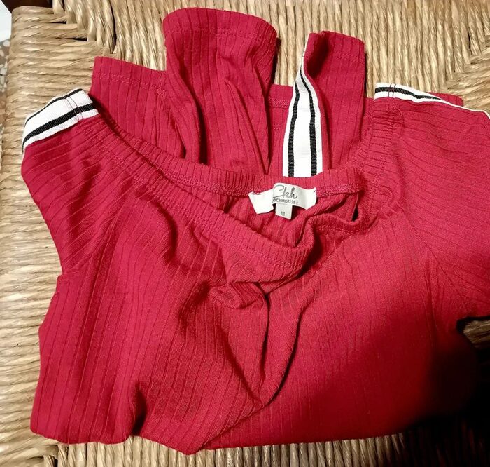 Particolare e molto carina, da portare aderente scoprendo le spalle. Composizione in foto. Ascelle a riposo 37 cm. Ottimo stato. Bel rosso scuretto. .