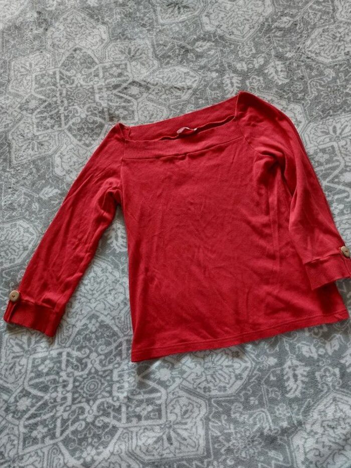 Maglietta rossa con scollo a barca e maniche a 3/4, taglia XS, 100% cotone, in buone condizioni. .