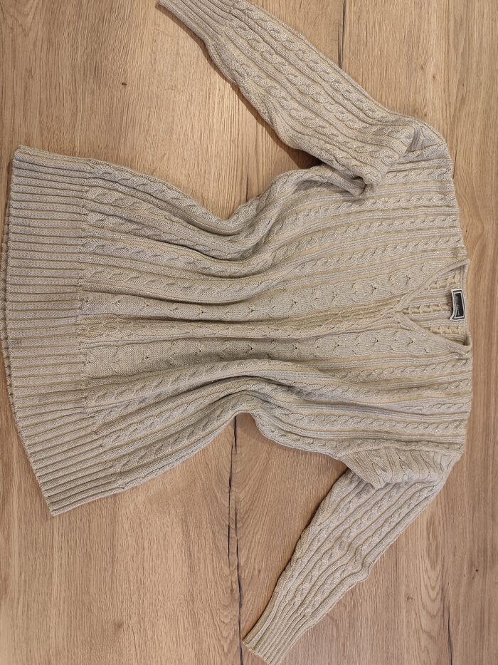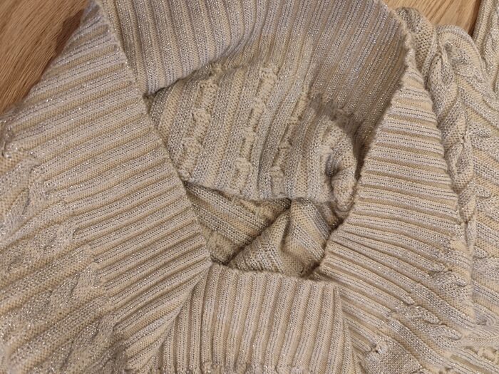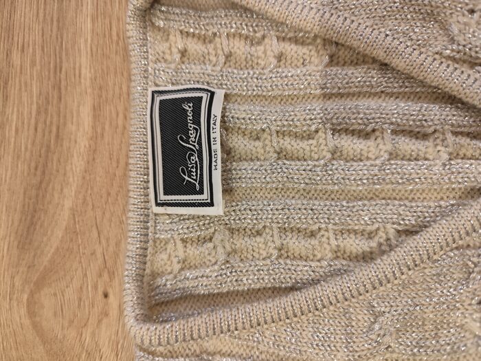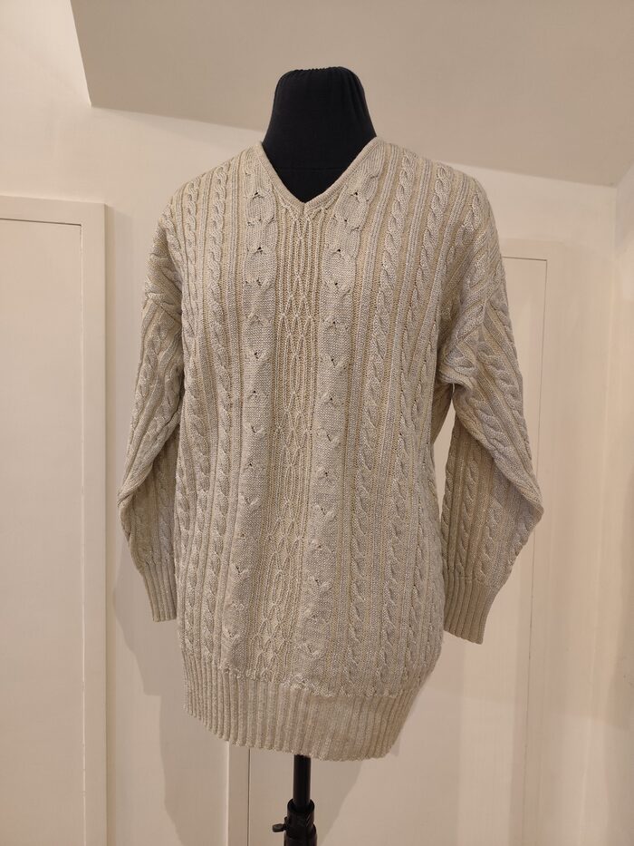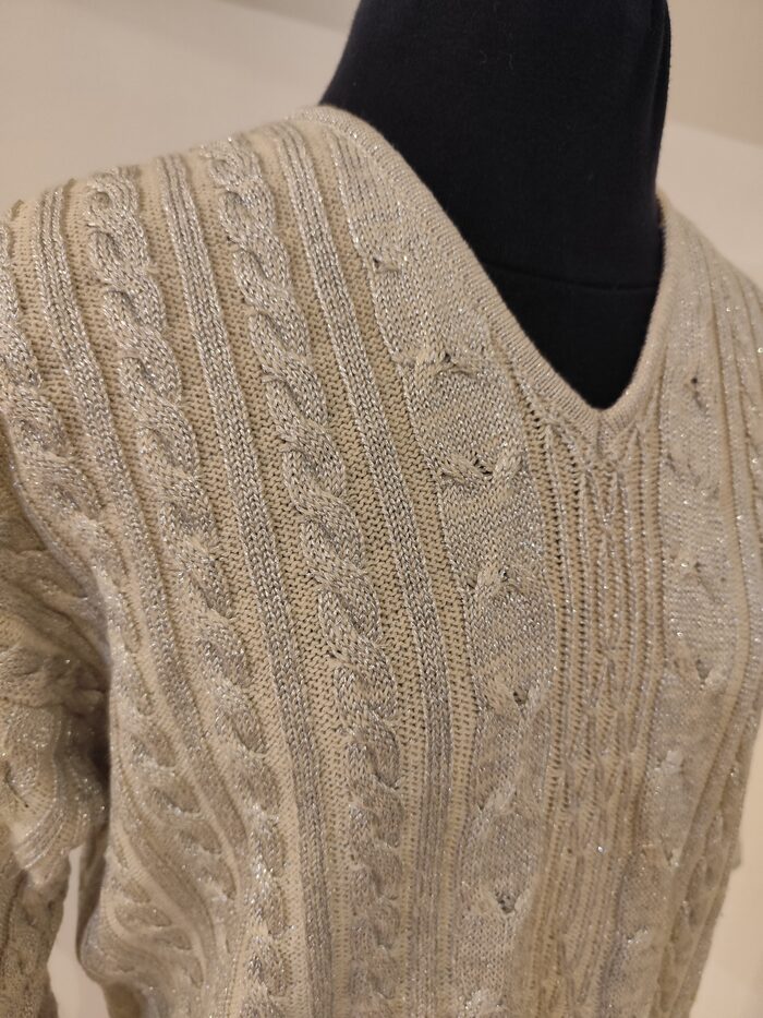 Maglioncino Luisa Spagnoli con scollo a V e decorazione intrecciata sul davanti. Molto bello e morbido, in colore panna e argentato, un po’ lungo e con giromanica ampia. Di ottima qualità, made in Italy, in perfetto stato senza difetti.
