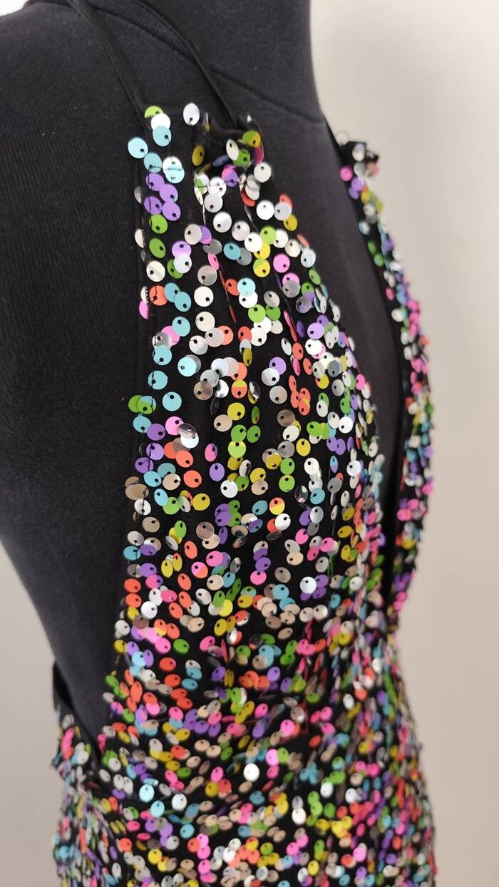 Mini abito molto particolare, in tessuto nero e tulle ricamato con paillette colorate. Modello con gonna corta a portafoglio con pieghe e fondo arrotondato; top scollato con due fasce che coprono il seno e schiena scoperta. In ottime condizioni, non ha difetti.