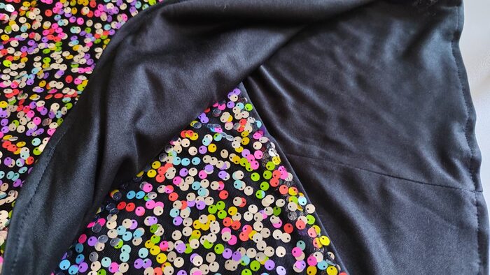 🧵Tessuto sintetico e paillette colorate in plastica, non ha etichetta composizione.