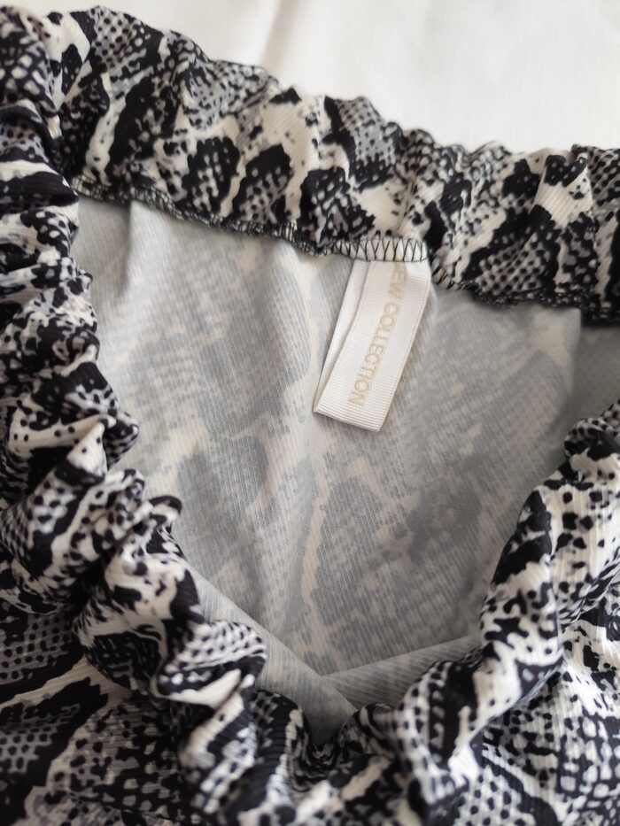Mini gonna bianca e nera con fantasia pitonata New Collection. Modello corto asimmetrico con due balze e arricciatura in vita. Molto carina e particolare, è in perfetto stato, senza difetti.