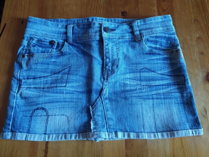Minigonna di jeans Cache cache tg 36 vita cm 38, lunghezza cm 31, 98% cotone, 2% elastan. .