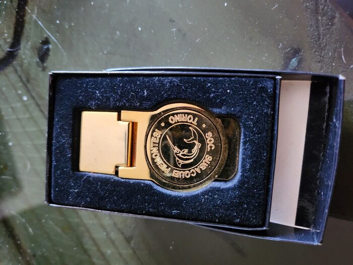 Molla fermasoldi in metallo dorato, cm 6, con logo di società sportiva. .