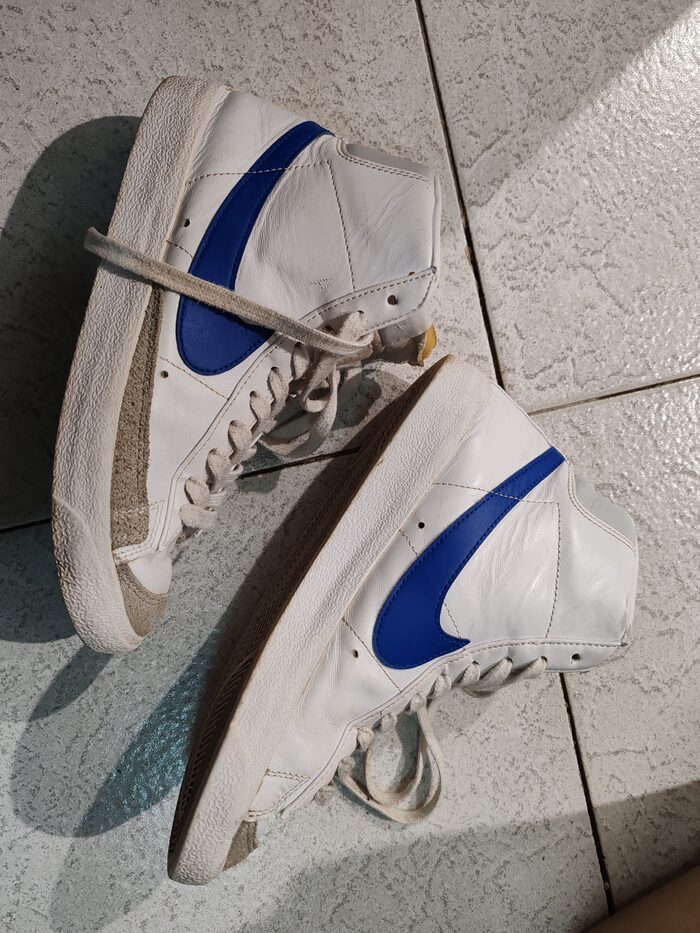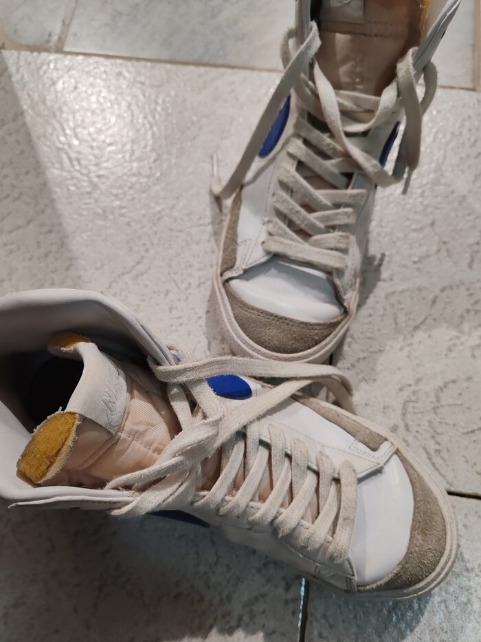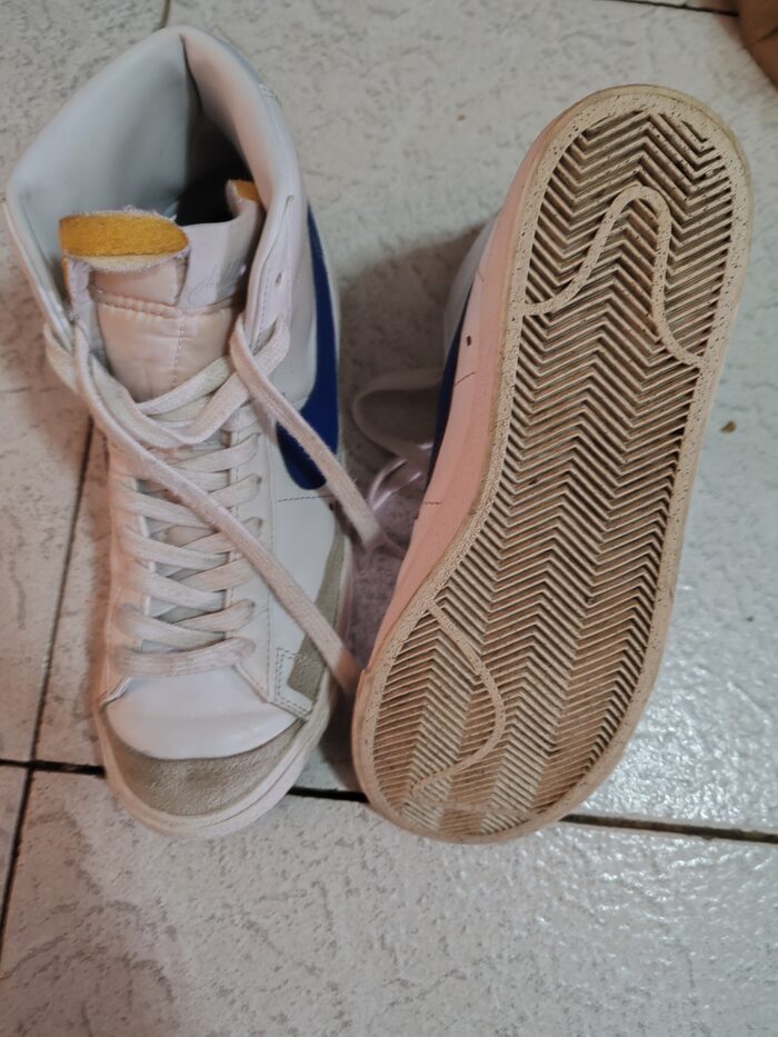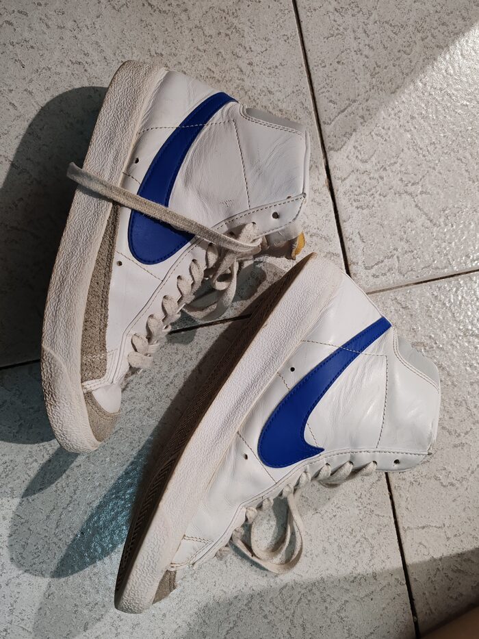 Scarpe Nike blazer. Taglia 40. Consiglierei di sostituire le stringhe. Per il resto qualche riga impercettibile. La gomma piuma a vista c'era già appena acquistate. Unisex ragazzi o adulti. Non ho più la scatola .