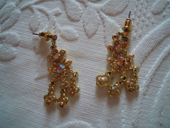 Orecchini pendenti, un paio di centimetri, color oro con pietruzze brillanti .