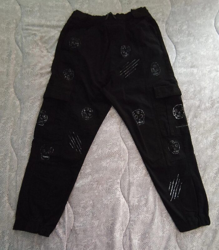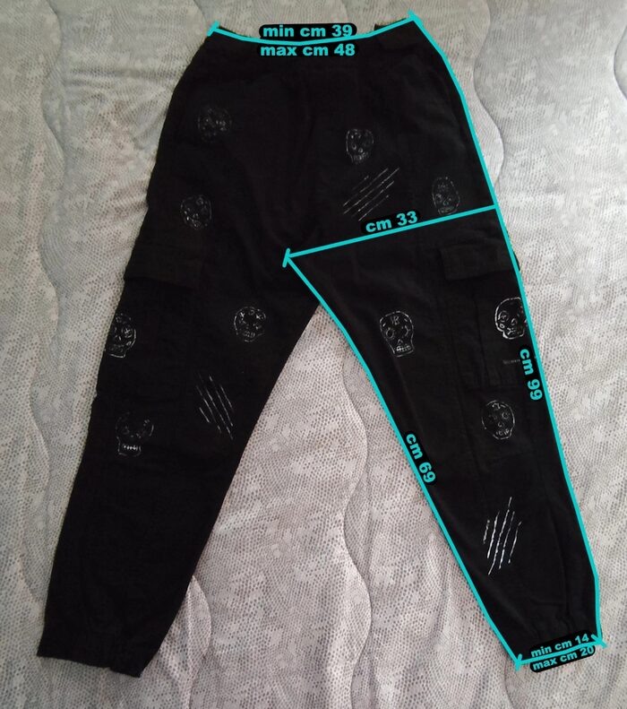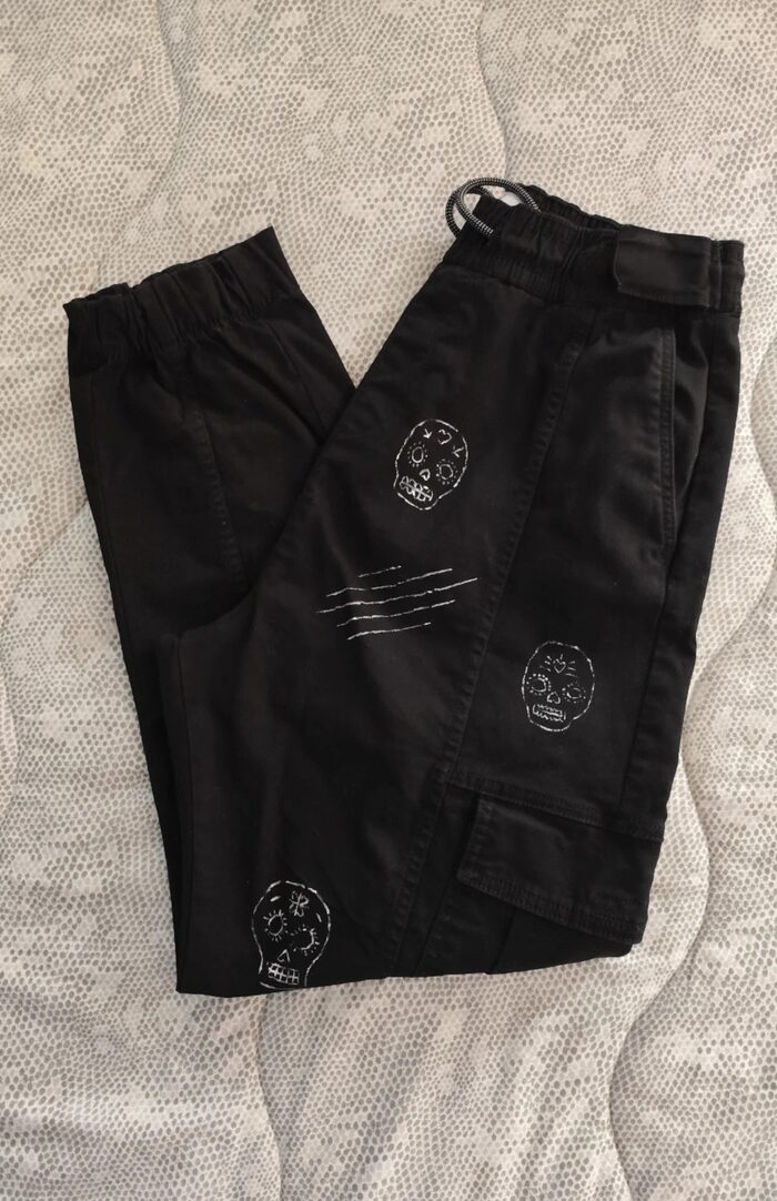 Pantalone cargo nero Bershka, modello stretto con cavallo basso, elastico in vita con possibilità di stringere e diverse tasche. Decorazione realizzata a mano, teschi messicani decorati. Stile dinamico, street e sportivo. In ottime condizioni come da foto.