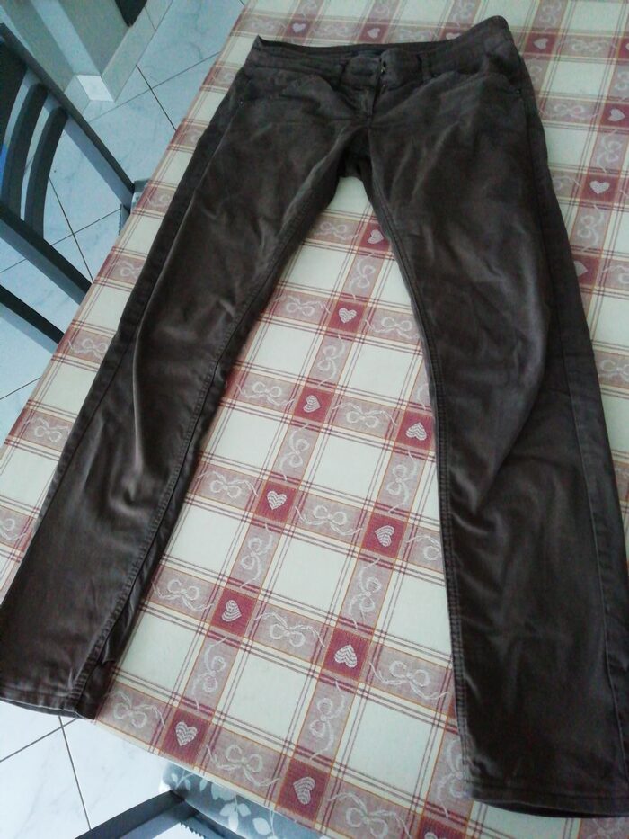 Marrone scuro scuro, gamba che va a stringere un po in fondo 98 cotone 2 elast calza bene molto morbido. Vita 41cm cavallo 21 cm .