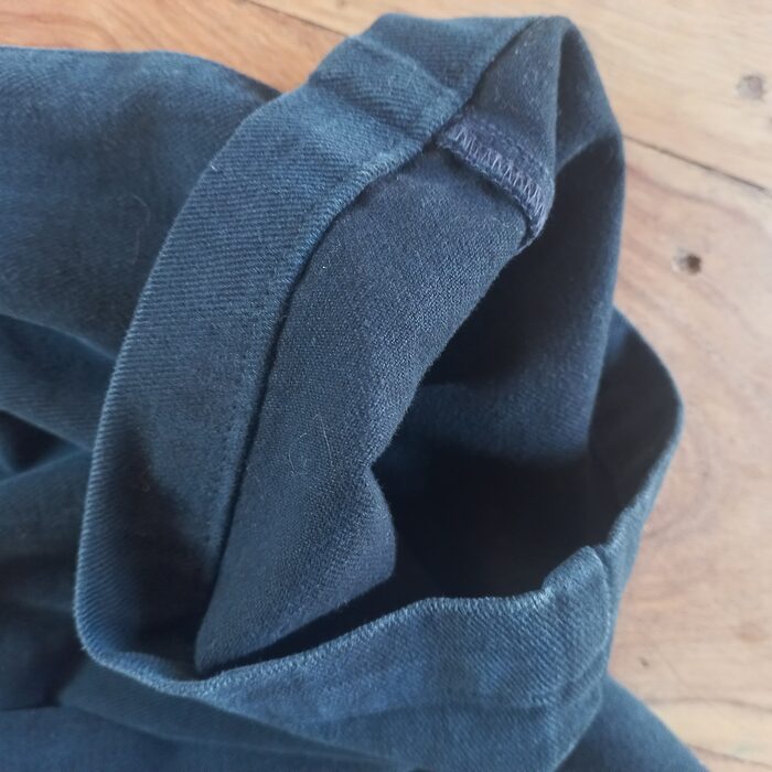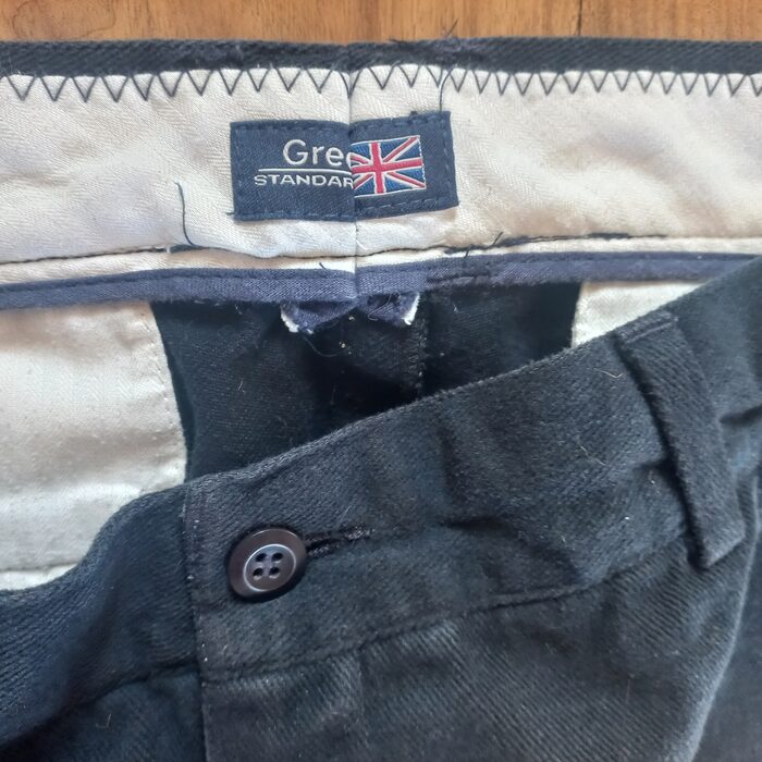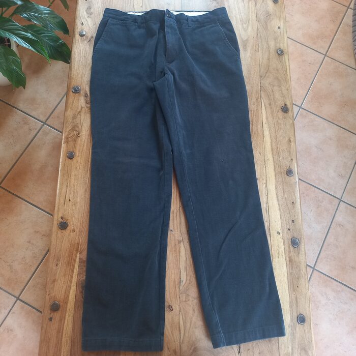 Bei pantaloni da uomo blu scuri, abbastanza pesanti, non c'è composizione ma visti così sono 100% cotone.