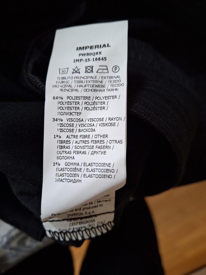 Composizione: 64% polyester, 34% viscosa, 1% elastan, 1% altre fibre.