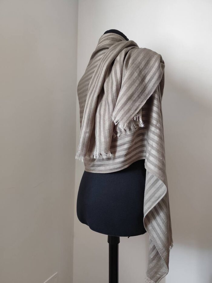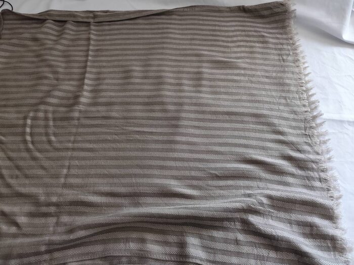 Pashmina scialle in tessuto leggero 100% viscosa color marrone e nocciola. Tessuto fresco con fantasia a righe verticali e lavorazione drill, frangia corta decorativa, da indossare in vari modi, è in perfetto stato, senza difetti.