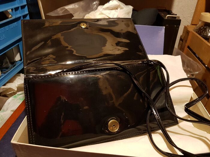 Pochette in vernice nera usata pochissimo, con tracolla, cm 28 x 14, chiusura a bottone. .
