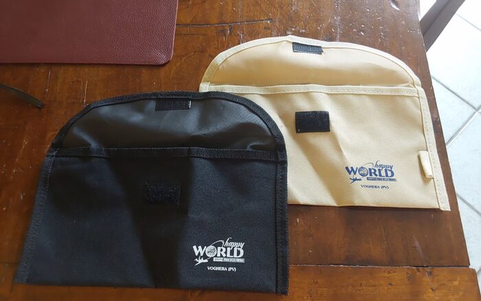 Portadocumenti da viaggio, agenzia happy world, in stoffa. Misure 27x15. 5 crediti l''uno. .