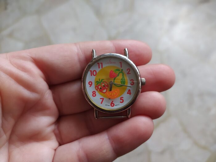 So che sarà impossibile ma ci provo. Questo è il quadrante del mio orologio da piccola, non so se abbia un valore ma sicuramente è un ricordo.Io l''ho anche cercato su internet ma non trovo nulla, aveva un cinturino in gomma giallo con in rilievo sempre in gomma la frutta (ananas arancia pere fragola se non ricordo male).Mi piacerebbe ricomporlo, se qualcuno ha qualcosa o lo trova se mi avvisate grazie (Sono disposta anche a comprare cifre ragionevoli) .