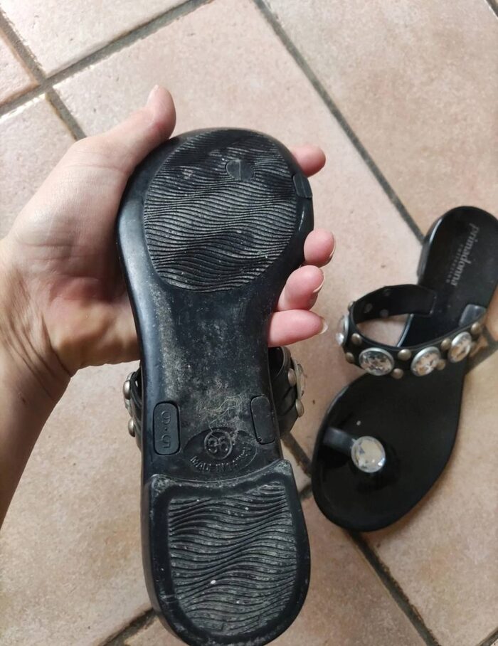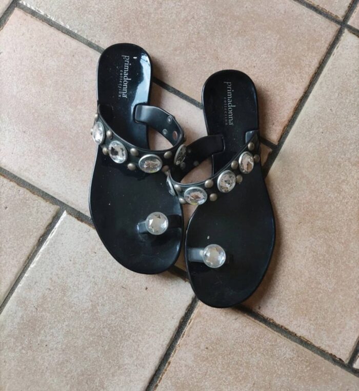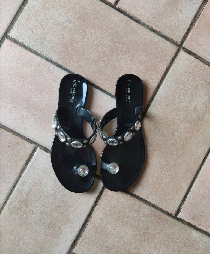 Usato pochissimo, suola e fondo in gomma, nere lucide infradito con dettaglio gioiello. .