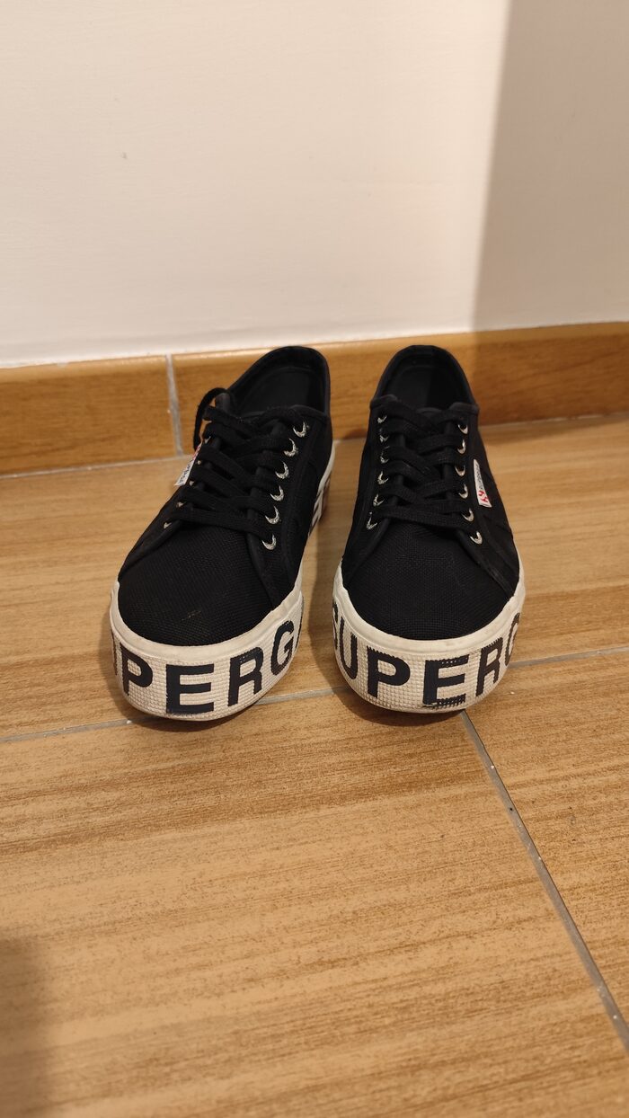 Scarpe da tennis Superga, nere, numero 39. Modello semplice con suola rialzata in gomma, attorno al plateaux ha la scritta SUPERGA, in ottime condizioni, usate poco, un po’ rovinata la scritta in alcuni punti, non ne compromette la bellezza, originali, lavate e pulite.