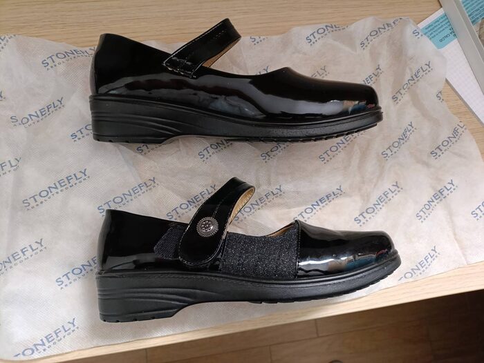 Scarpe da donna come in foto, nuove ma senza la scatola originale (per spedire ne userò un'altra). Hanno ancora l'etichetta adesiva all'interno, non sono di pelle. Il cinturino ha un bottone decorativo e si chiude con il velcro. Misura indicata 40 ma calzano un pochino meno, direi adatte a un 39,5 .