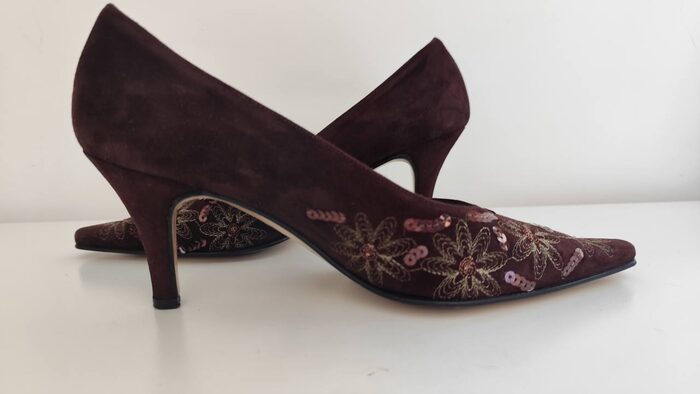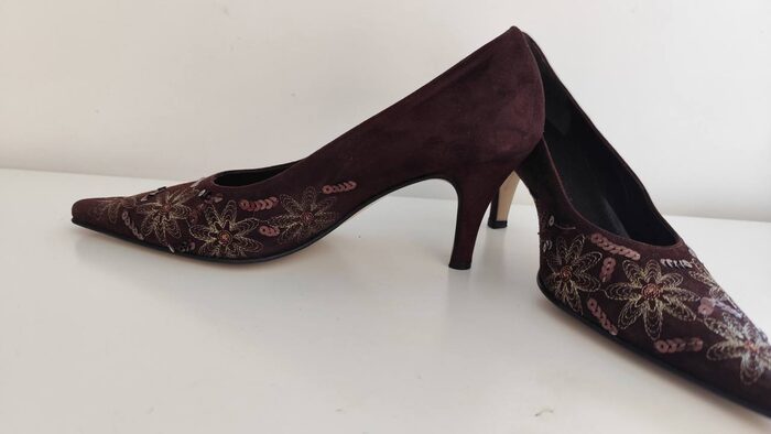 Scarpe marroni eleganti da donna in pelle scamosciata e cuoio, made in Italy. Modello con tacco basso, punta lunga e decorazioni luminose create con ricami floreali dorati e paillettes, uniche e vintage. In ottime condizioni come si vede in foto.