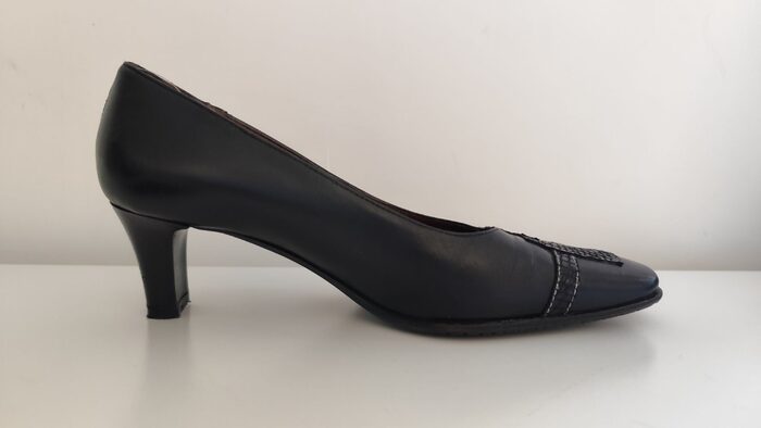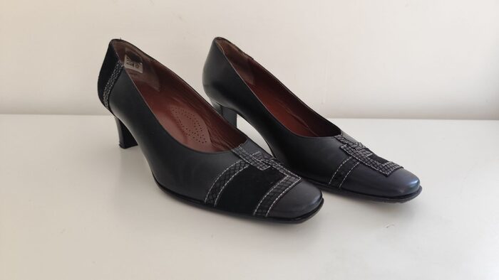 Scarpe nere eleganti da donna in pelle, modello con tacco basso a punta quadrata. Decorazione sulla scarpa con fantasia geometrica realizzata con diversi tipi di pelle; sono in ottime condizioni, hanno solo qualche piccolo graffio interno.Materiali: pelle, cuoio, gomma.Taglia da donna n° 36, tacco alto cm 5,5. .