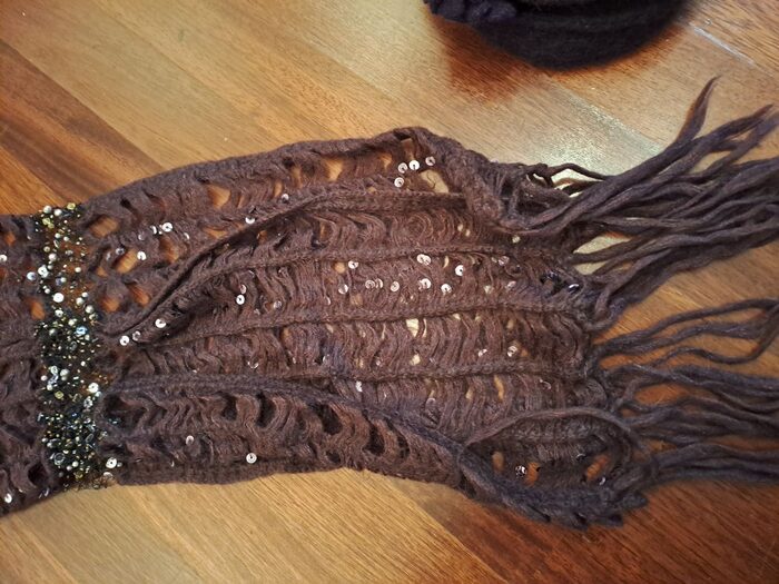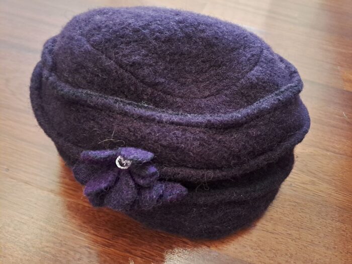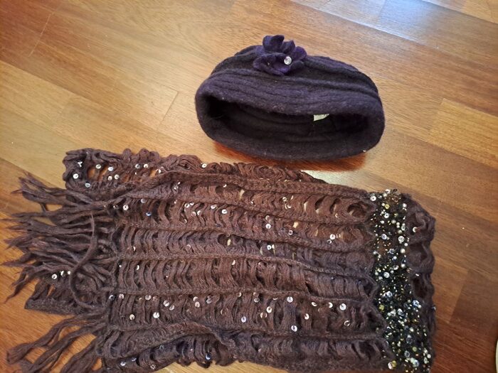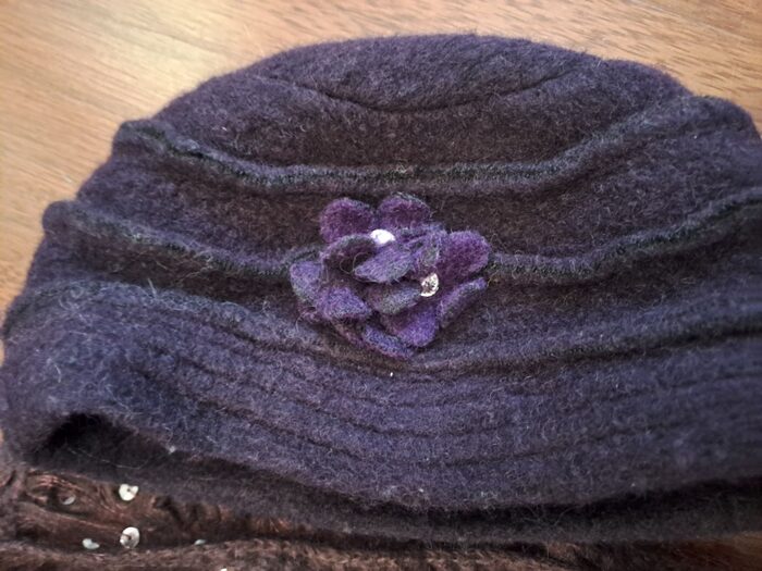 Cappello in lana cotta con fiore color viola scuro Sciarpa in lana con tante applicazioni in strass e paillettes , molto bella , viola scuro .