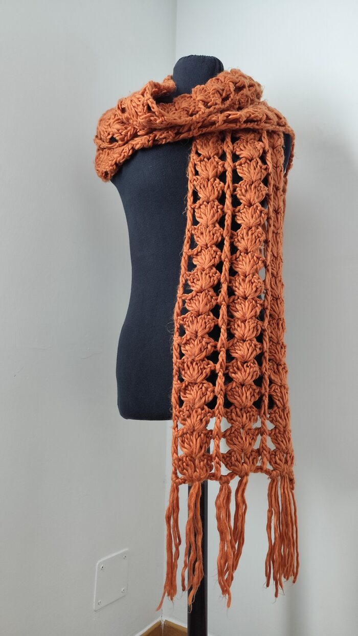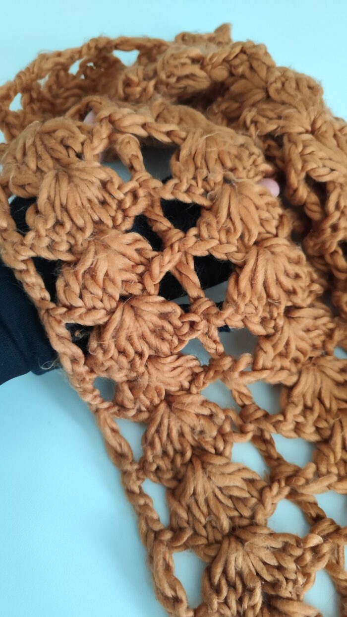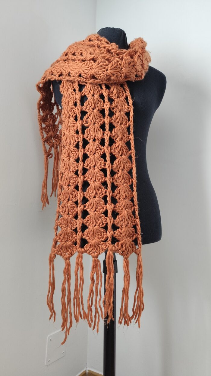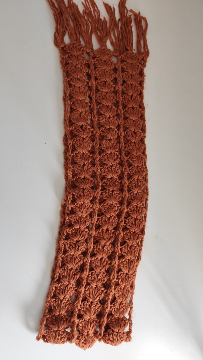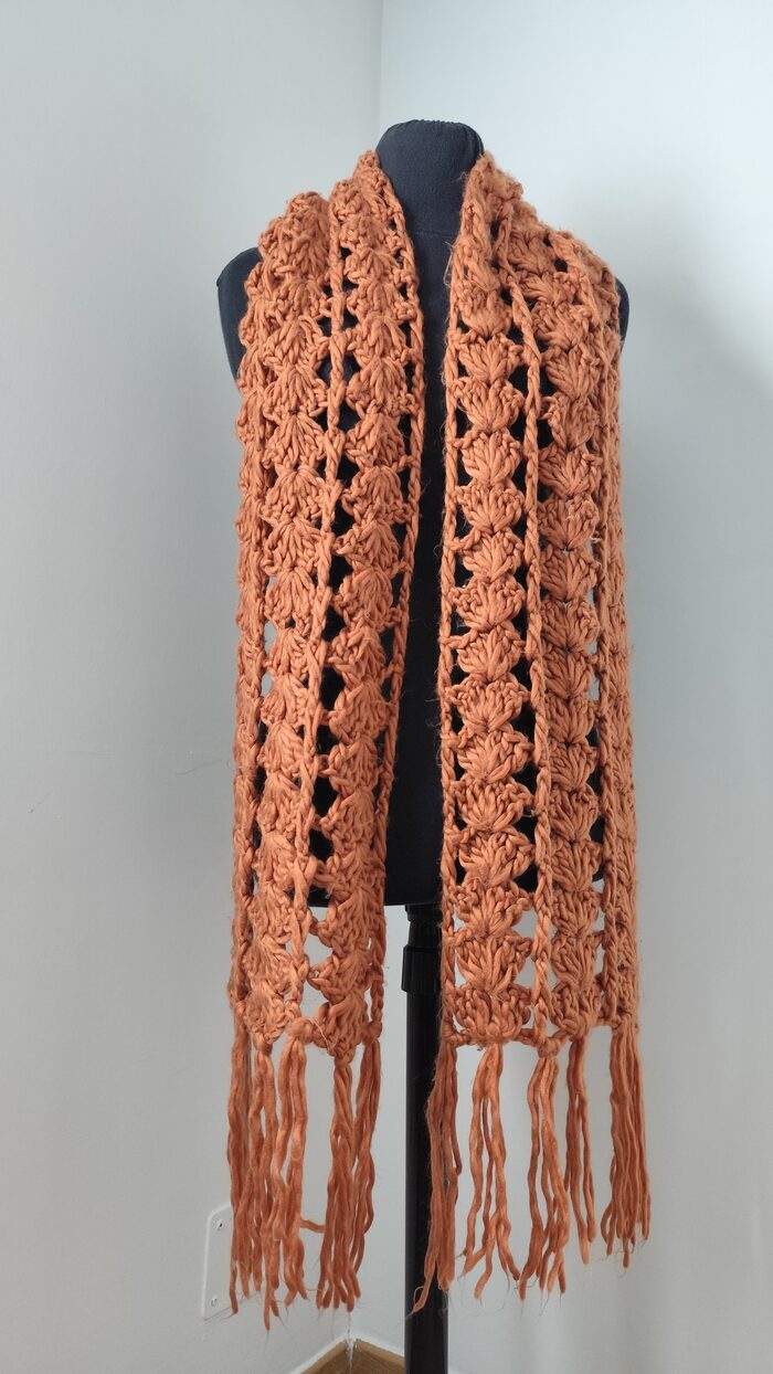 Sciarpa lunga marrone, in filato morbido, lavorazione traforata realizzata all’uncinetto. In ottime condizioni, texture pelosa, calda e versatile.