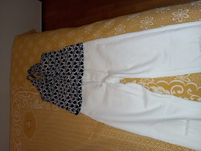 Jeans bianchi con strappi al ginocchio in cotone elasticizzato, top con imbottitura al seno,da allacciare al collo in poliestere. Taglia 38 .
