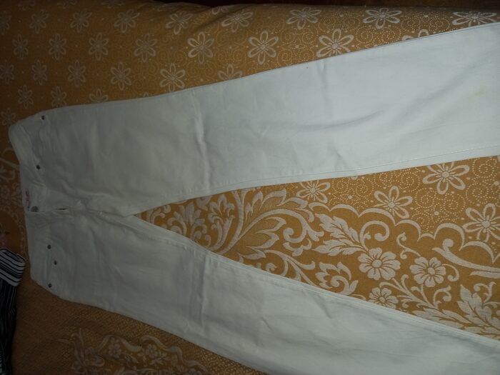 Camicetta maniche lunghe in poliestere, jeans bianchi a sigaretta on cotone leggermente elasticizzato,tg 38,ma secondo me possono andare bene anche a un 40. Misure su richiesta. In ottime condizioni .