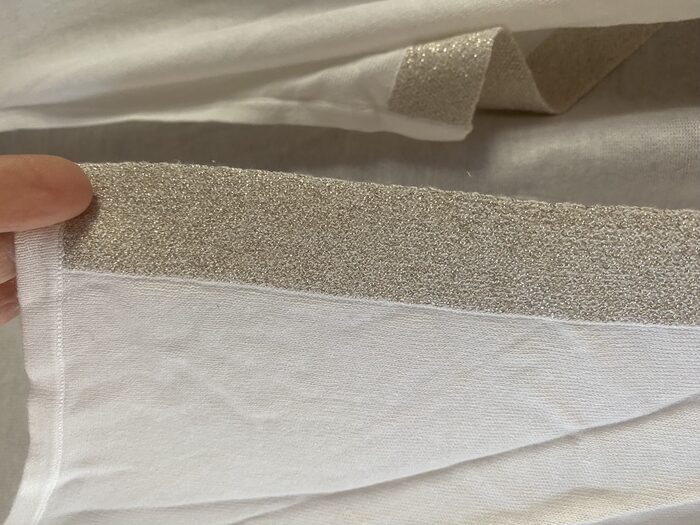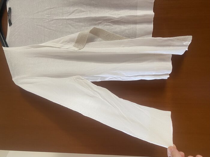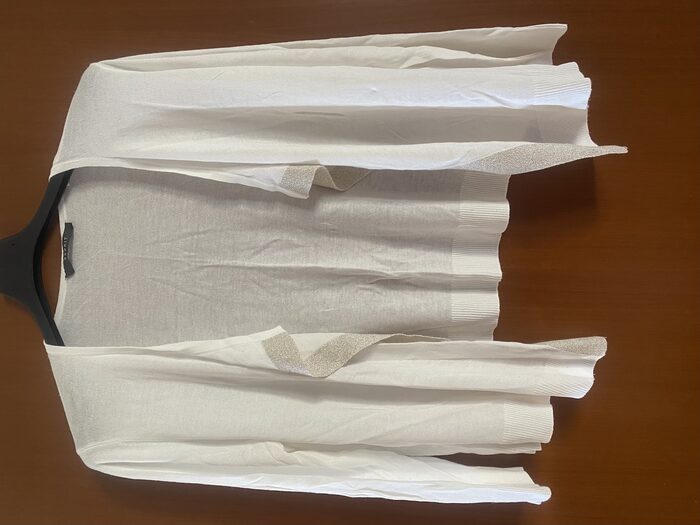Copri spalle con manica tre quarti aperto sul davanti, non c’è l’etichetta con la composizione, ma è in viscosa e forse misto sera, molto fresco. Sul davanti rimane aperto e ha decorazione con lurex dorato