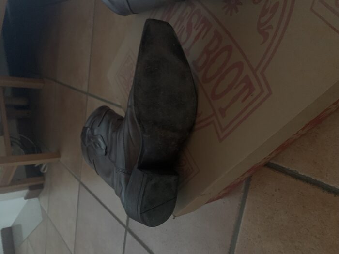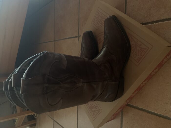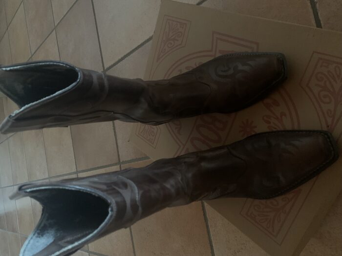 Stivali da cowboy, sono stati usati molto e presentano segni di usura internamente (vedi foto 4) ma esternamente e la suola sono in ottime condizioni. L'etichetta riporta misura 43 ma Calzano un 42 .