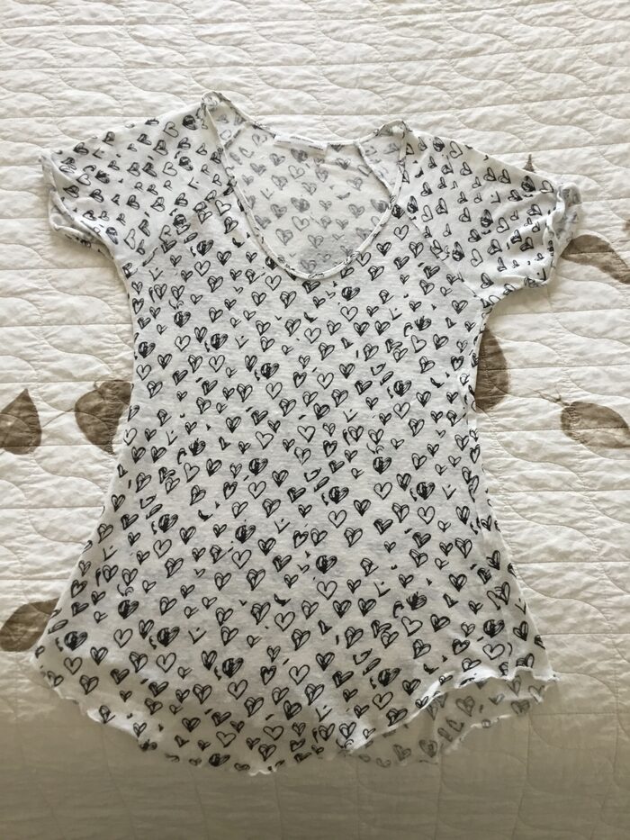 T-shirt bianca Zara con tanti cuoricini neri, fondo stondato e maniche raglan. Tg S e queste le misure: ascelle 38, lunghezza max 67.