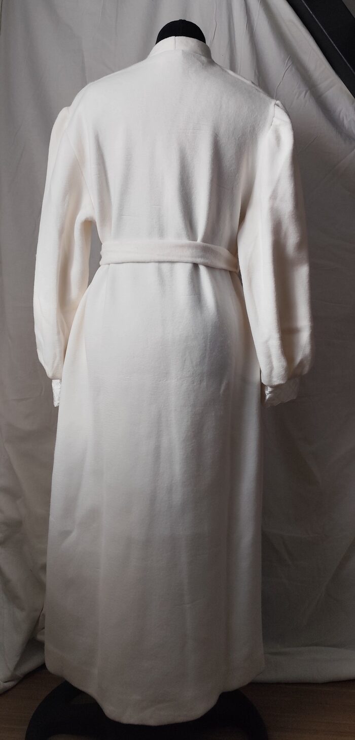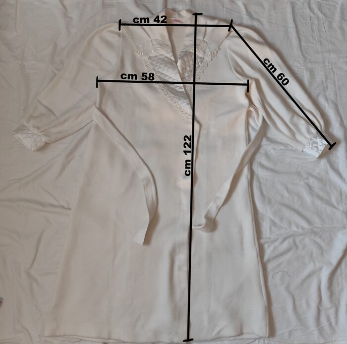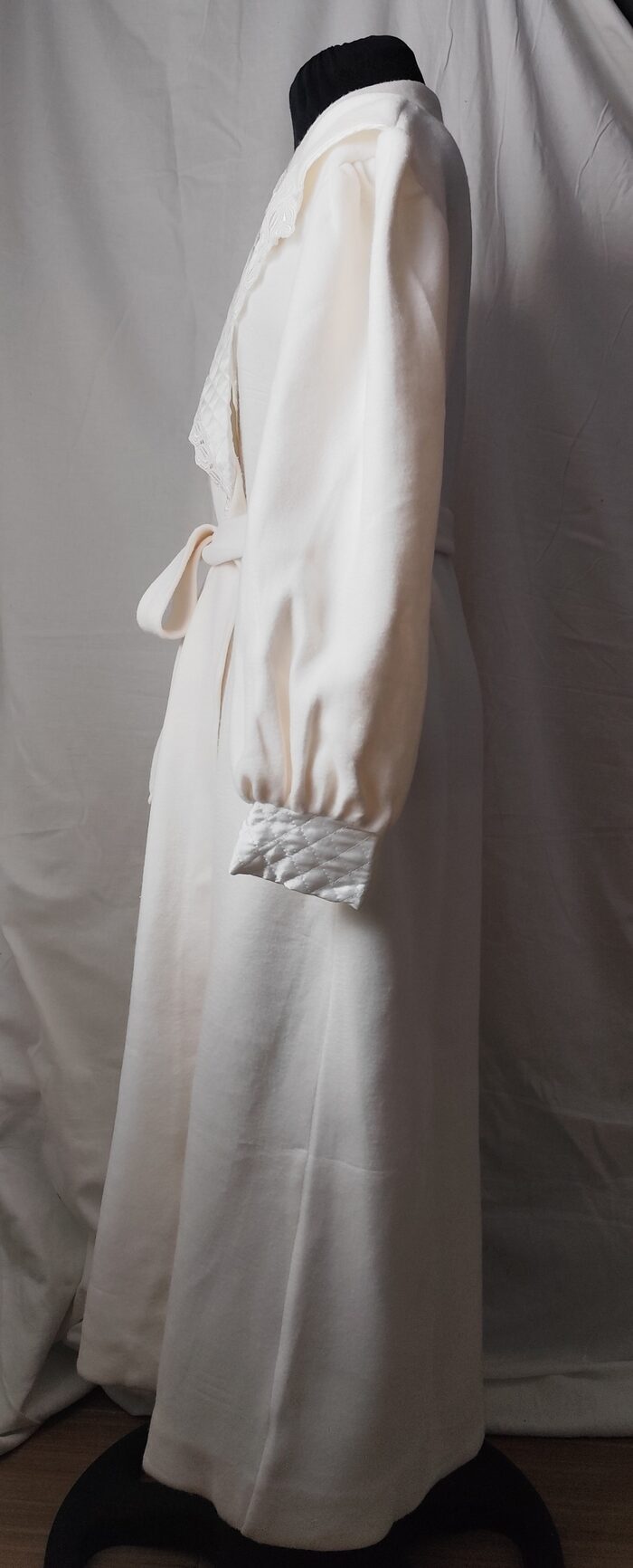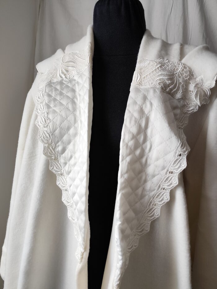 Vestaglia vintage anni ‘80/’90 bianca invernale. Modello lungo con maxi collo a scialle, maniche ampie con polsino e cintura in vita. Ha una tasca laterale e la chiusura interna con laccetto. Tessuto pesante morbido, e decorazioni in pizzo e tessuto trapuntato. Molto bella e unica, per essere sempre elegante.