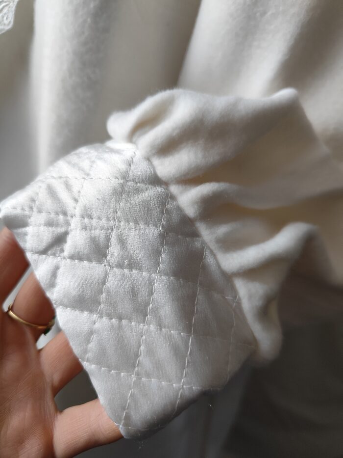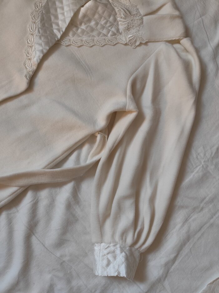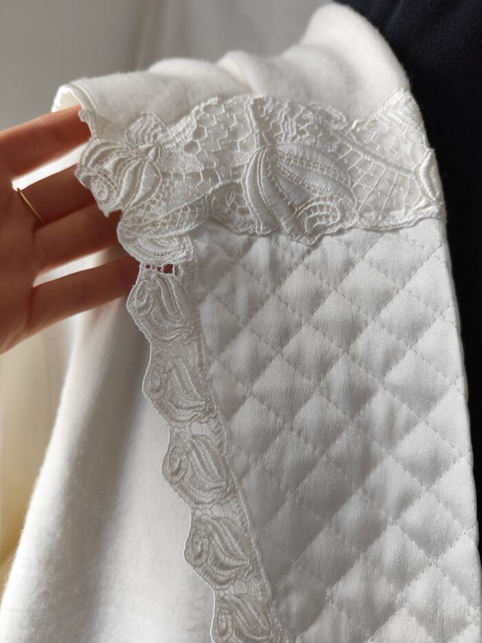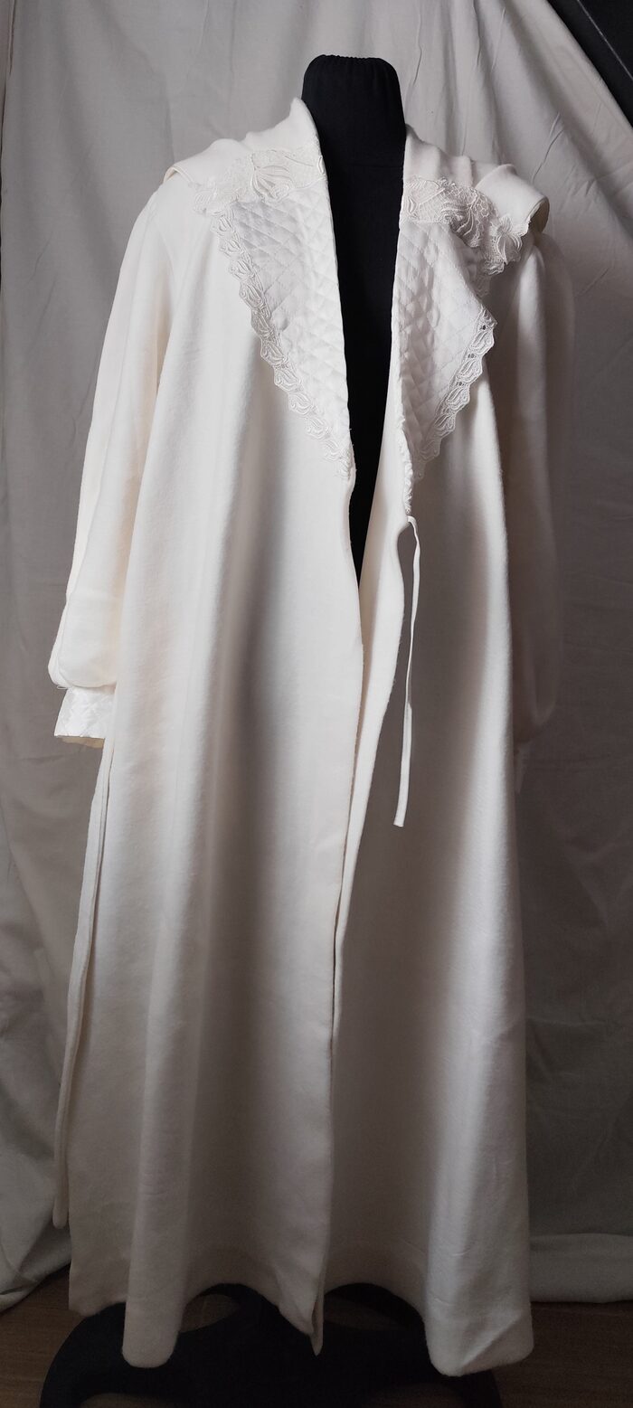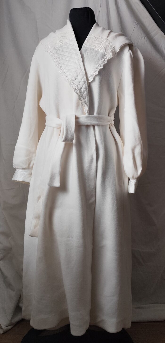 Vestaglia vintage anni ‘80/’90 bianca invernale. Modello lungo con maxi collo a scialle, maniche ampie con polsino e cintura in vita. Ha una tasca laterale e la chiusura interna con laccetto. Tessuto pesante morbido, e decorazioni in pizzo e tessuto trapuntato. Molto bella e unica, per essere sempre elegante.