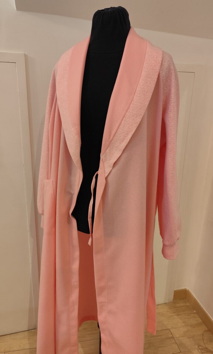 Vestaglia vintage anni ‘80/’90 rosa invernale. Modello lungo con maxi collo a scialle, maniche raglan ampie con polsino e cintura in vita.